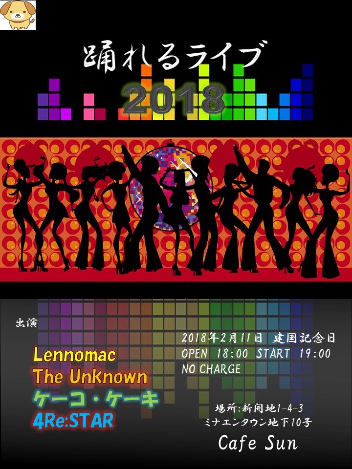 08 February 告知!! きたる2/11(日)☆彡踊れるライブ2018を開催いたします\(^o^)/とにかく踊れるナンバーを4組のスペシャルバンドさんが響きわたらせます!!!!お店の雰囲気はガラリと変えましてSUNはダンスホールになっちゃいます♪踊るってどんな。。?という方もご安心年代が入り乱れておりますので、ゴーゴーからパラパラまでなんでもあり(^_^.)適当です。。笑!お送りする曲もディスコナンバーとは限りません、そこがこのライブのいいとこですね☆ノーチャージ お楽しみに♪*フライヤ 一部変更あり PR