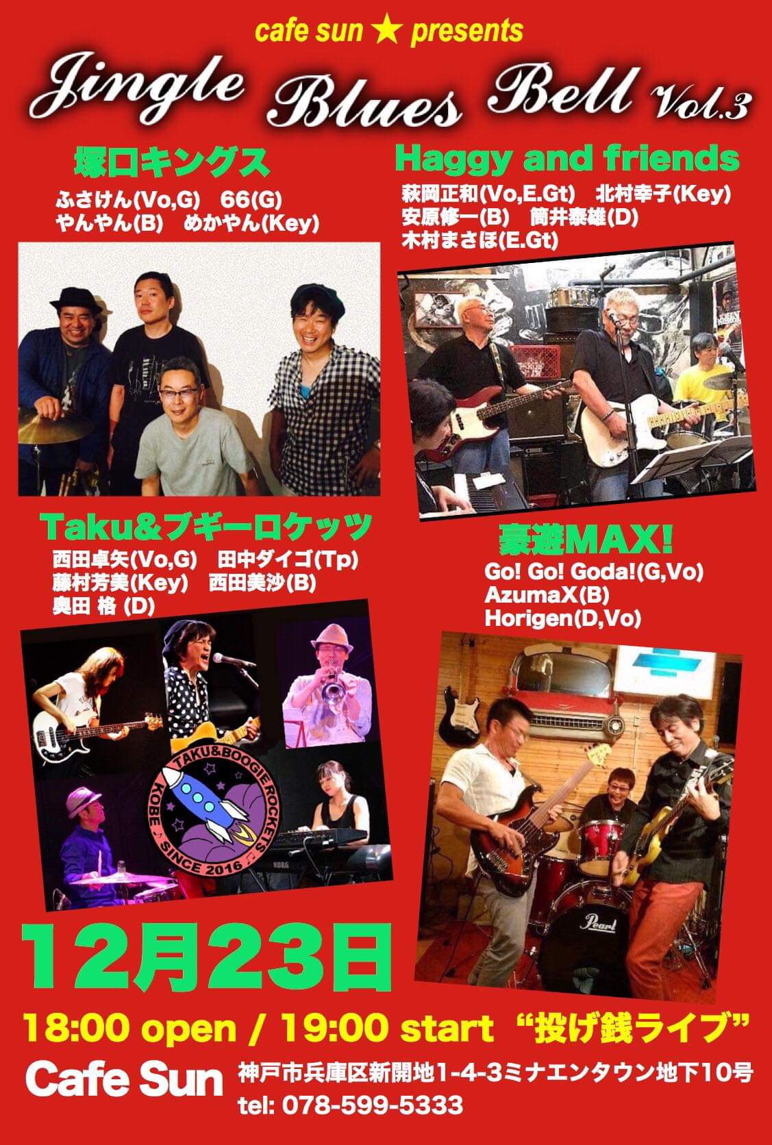 23 December じんぐる 本日はジングルブルースベール!!!第三回の当イベントですが、今年はボリュームが凄い(*^_^*)そして濃厚ですね。。ラーメンで言うといや言いません。多く語る必要もないでしょう!お見逃し無く♪ 18時オープン☆☆☆彡