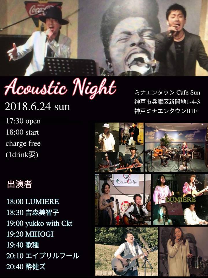 24 June Acoustic Night 本日はコレ~!!酔健ズさんプレゼンツ Acoustic Nightアコースティックな楽曲を中心に7組の演者様が盛り上げてくれます♪のーちゃーじ。 18時スタート!昨夜の長渕剛会も盛り上がりました☆ハーモニカ&ギターなどシンプルなサウンドも素敵ですね。今日の出演者様もシンプルな構成が多いですが、それゆえに一人一人がインパクト大です! お楽しみに~(*^_^*)