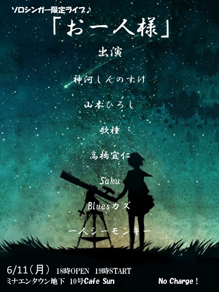 11 June 寂しくはない! 本日は ソロシンガー限定ライブ「お一人様」普段バンドの方も今日はお一人です。ソロでしか出来ないこともありますね!自問自答を繰り返し作った世界観!カバーでもオリジナルでもこの人がアレンジすると、こうなるのか~と思いながら聴いております。18時おーぷん 19時スタート!! のーちゃーじ(*^_^*)