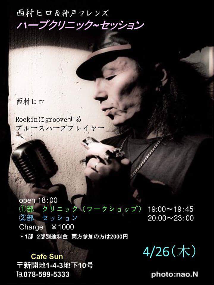 25 April 4/26 4/26日(木) 西村ヒロさんによるハープクリニック&セッション が行われます! クリニックが19時よりセッションが20時~です(*^_^*)東京でブルースハーププレイヤーとしてご活躍中の西村ヒロさん1度聴かせて頂きましたが、迫力がすごい♪決して大音量ではないのにバンドのサウンドに埋もれないんですね。素人意見で言うと「キレッキレ」の音ってとこでしょうか。。お勉強中の方もそうでない方も是非ご参加下さい!!!OPENは18時☆☆