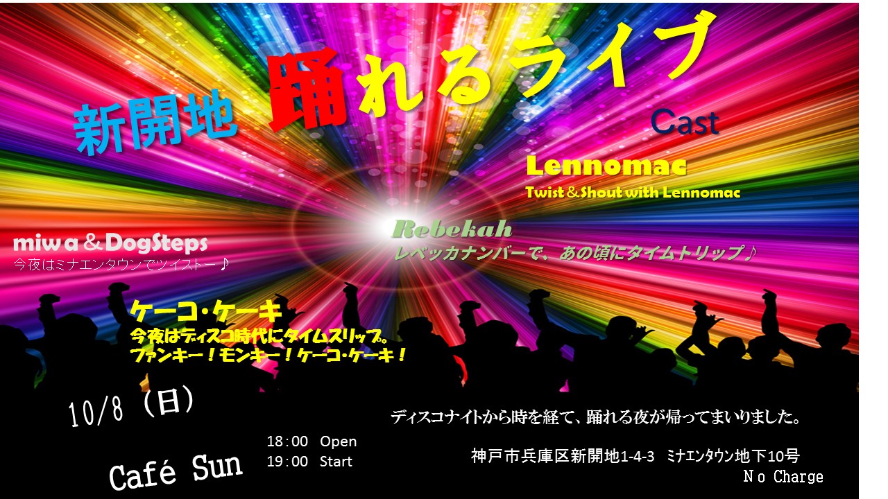 08 October ダンス!ダンス!ダンス! やってまいりました!本日はディスコナイトから進化した「踊れるライブ」でございます♪60~80年代の幅広い踊れる音が鳴り響きます(*^_^*)今日のSunはCafeからプチダンスホールに変身して営業いたします!入場無料!お気軽に~(゜-゜)