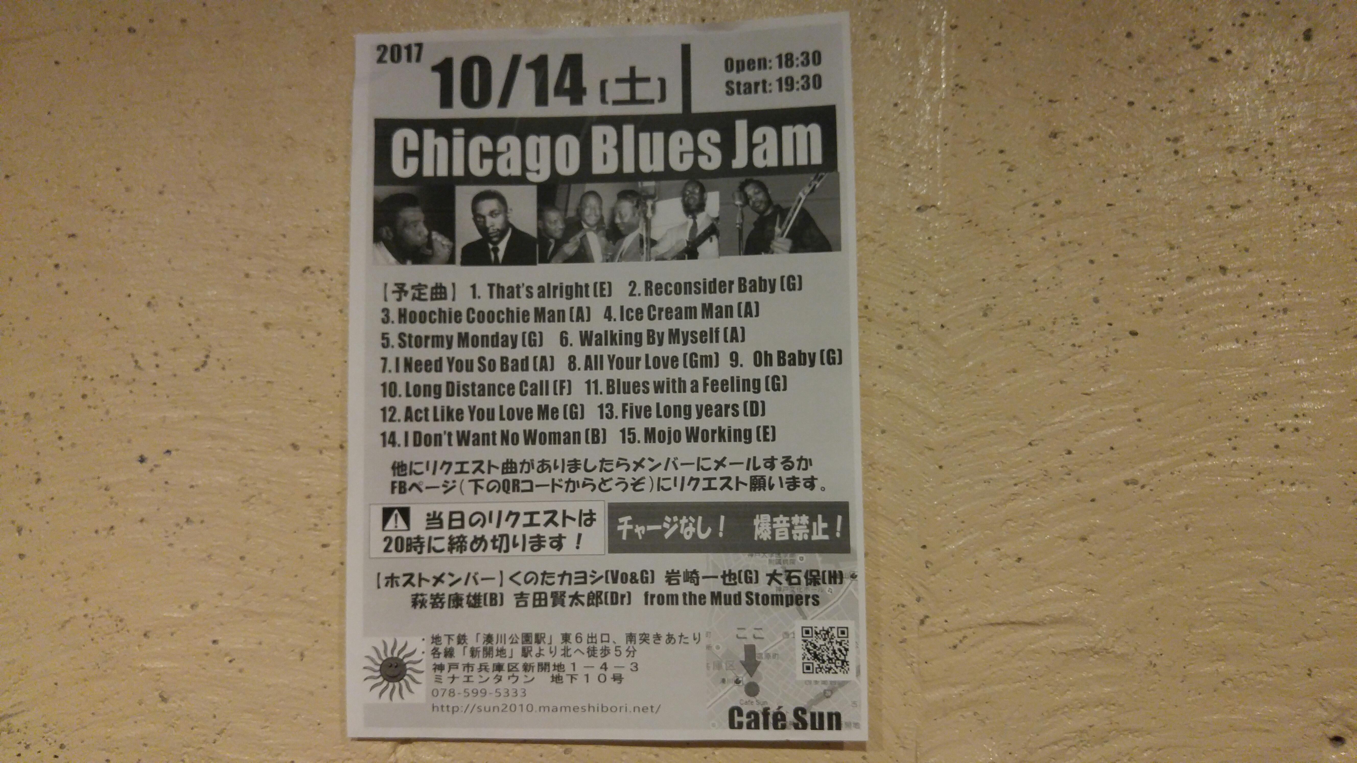 14 October シカゴ 本日はシカゴブルースJam!曲目、曲順を決めて進行します(*^_^*)チャージなし♪気軽にご参加下さい。ホストは泣く子も踊るthe Mud Stompersじっくり聴けるセッションです☆彡
