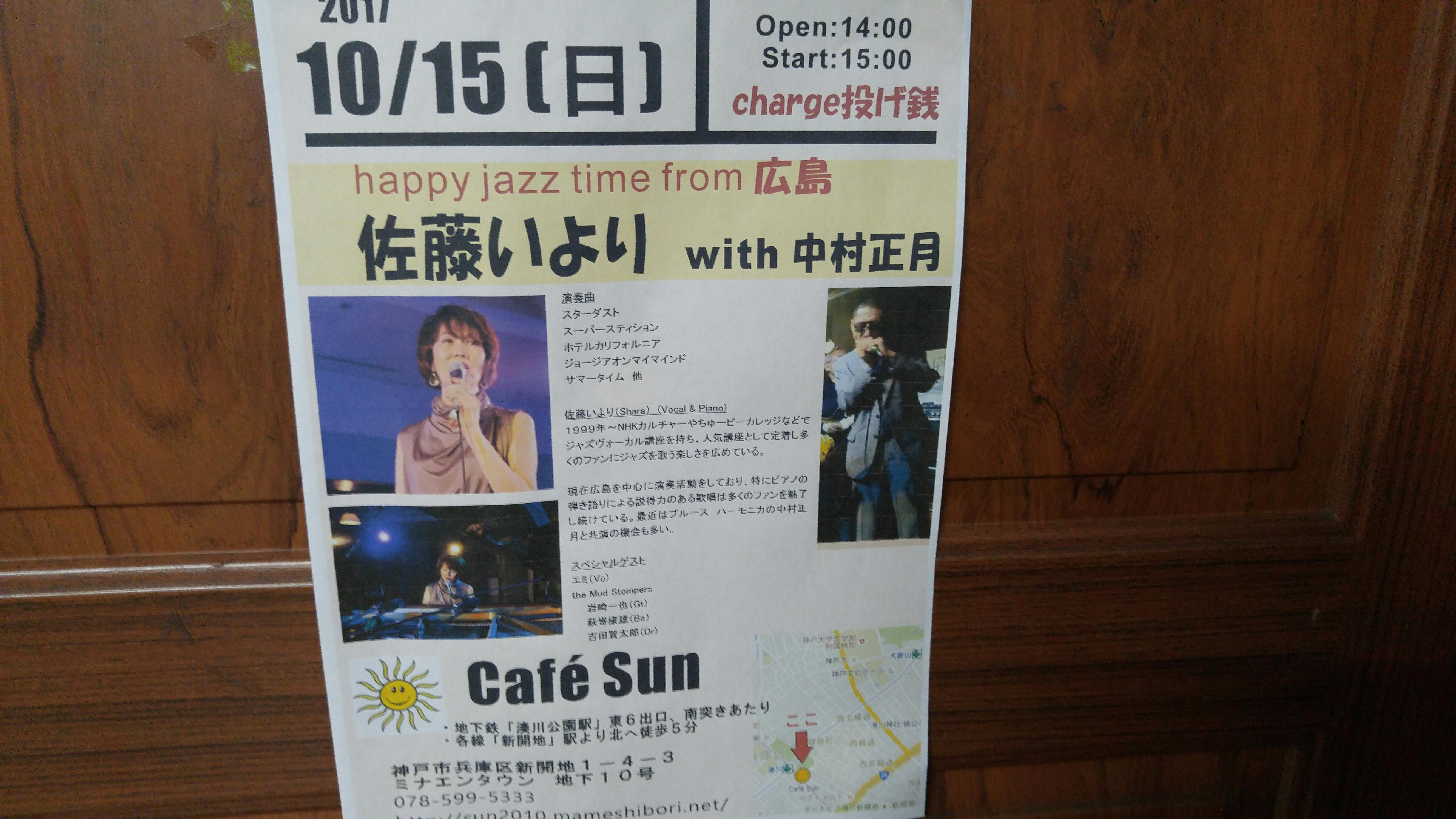 15 October 昼も夜も お昼は 「佐藤いよりwith中村正月」happy jazz time from広島14時OPEN 15時START広島からjazzヴォーカルの佐藤いよりさんとハーモニカ奏者の中村正月さんをお迎えしてのステージです♪スペシャルゲストはKmithからエミさん、そしてhe Mud Stompers!夜はスキスキビートルズ(*^_^*)ビートルズ系セッションです!一日通して楽しんでいってください☆彡