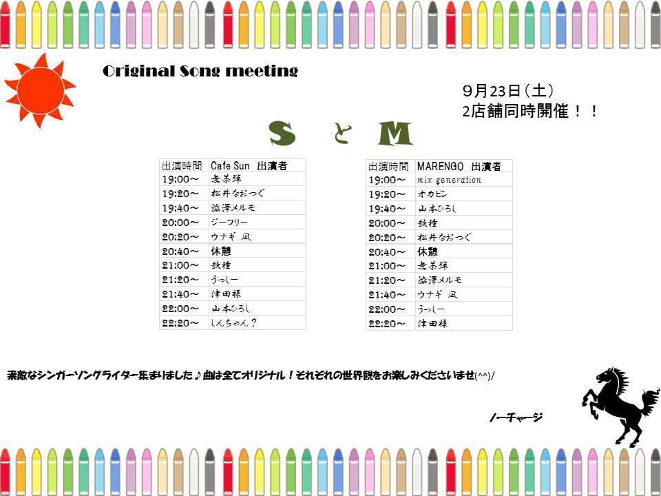 23 September オリジナルソングで~♪ 本日はシンガーソングライターを集め、世界にひとつのオリジナル曲を披露していただく企画「SとM」でっす(*^_^*)ちなみにSはサン、Mはマレンゴという意味ですよ!!その名の通り2店同時開催します♪出演者は夜な夜なミナエンに集う天才ミュージシャン達から、あらゆる所でライブを重ねる猛者まで様々! 彼らの心からのメッセージをご堪能くださいまし☆彡*一部変更あり