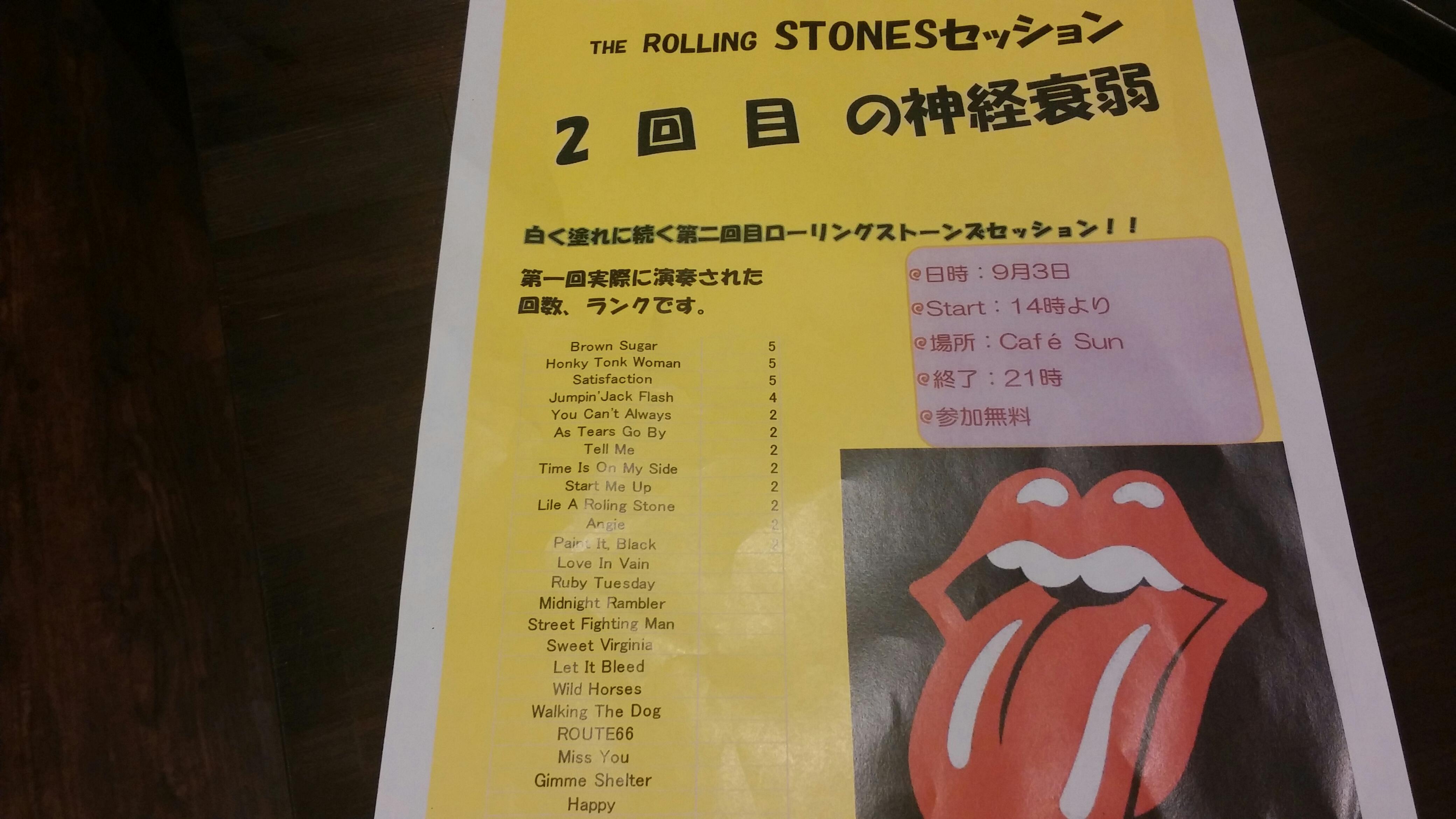 29 August おしらせー! 9月3日(日)14時より第2回目のローリングストーンズセッションが行われます。お気軽にご参加ください(*^_^*)お昼からやっちゃいますので、翌日の仕事の心配もないですね笑コード譜、歌詞はある程度ご用意しております♪かなりマニアックなやつは持ってきてください(^_^.)関西のロックの殿堂達がお待ちしております!