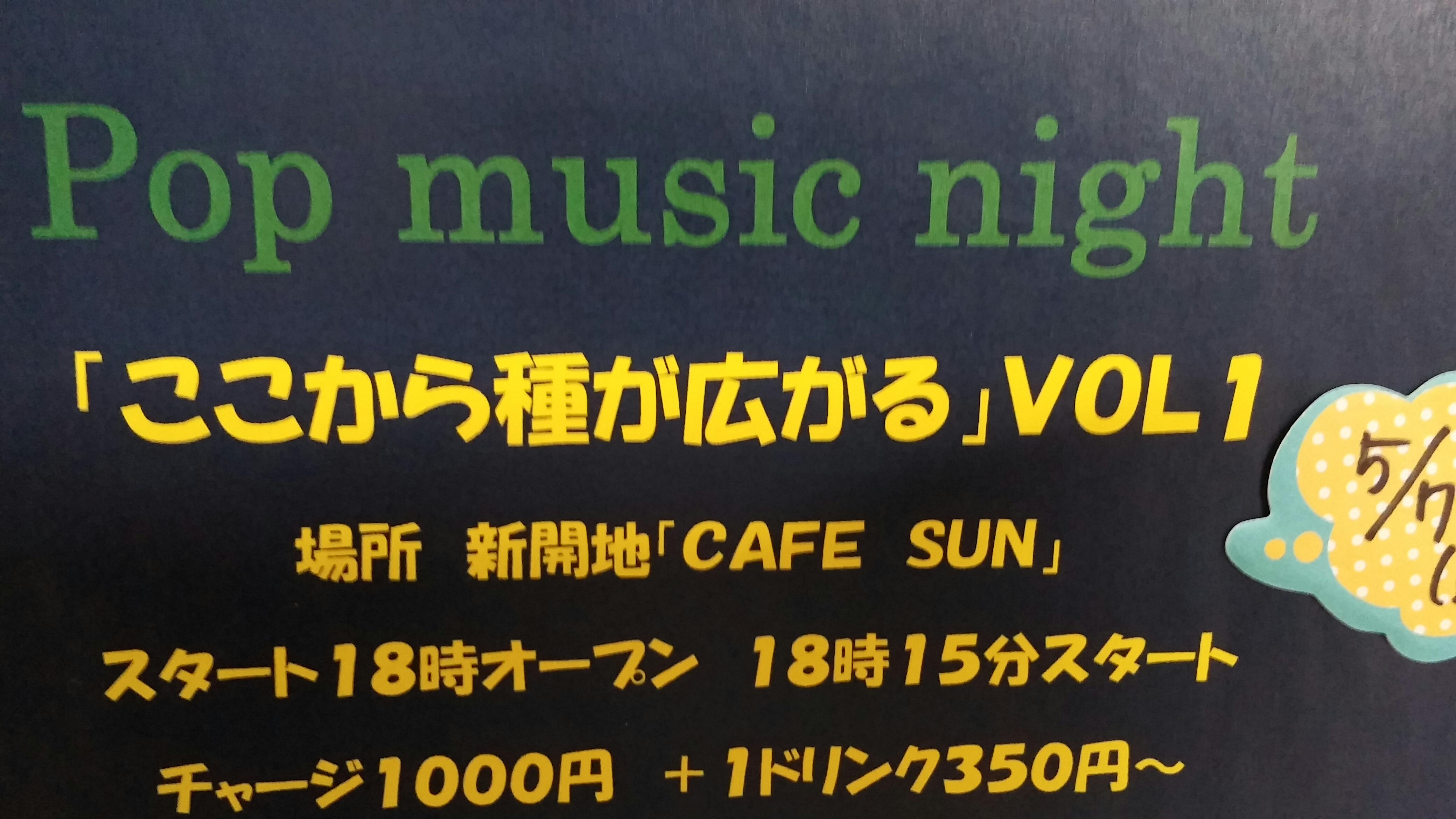 07 May 本日は CafeSun Popな一日になりそうです。春らしい爽やかな音(*^_^*)聴きに是非いらしてください。出演歌種うまやはらつかさ筒井洋司CHICHIフミキHIKARIやすいFROM(よさく)